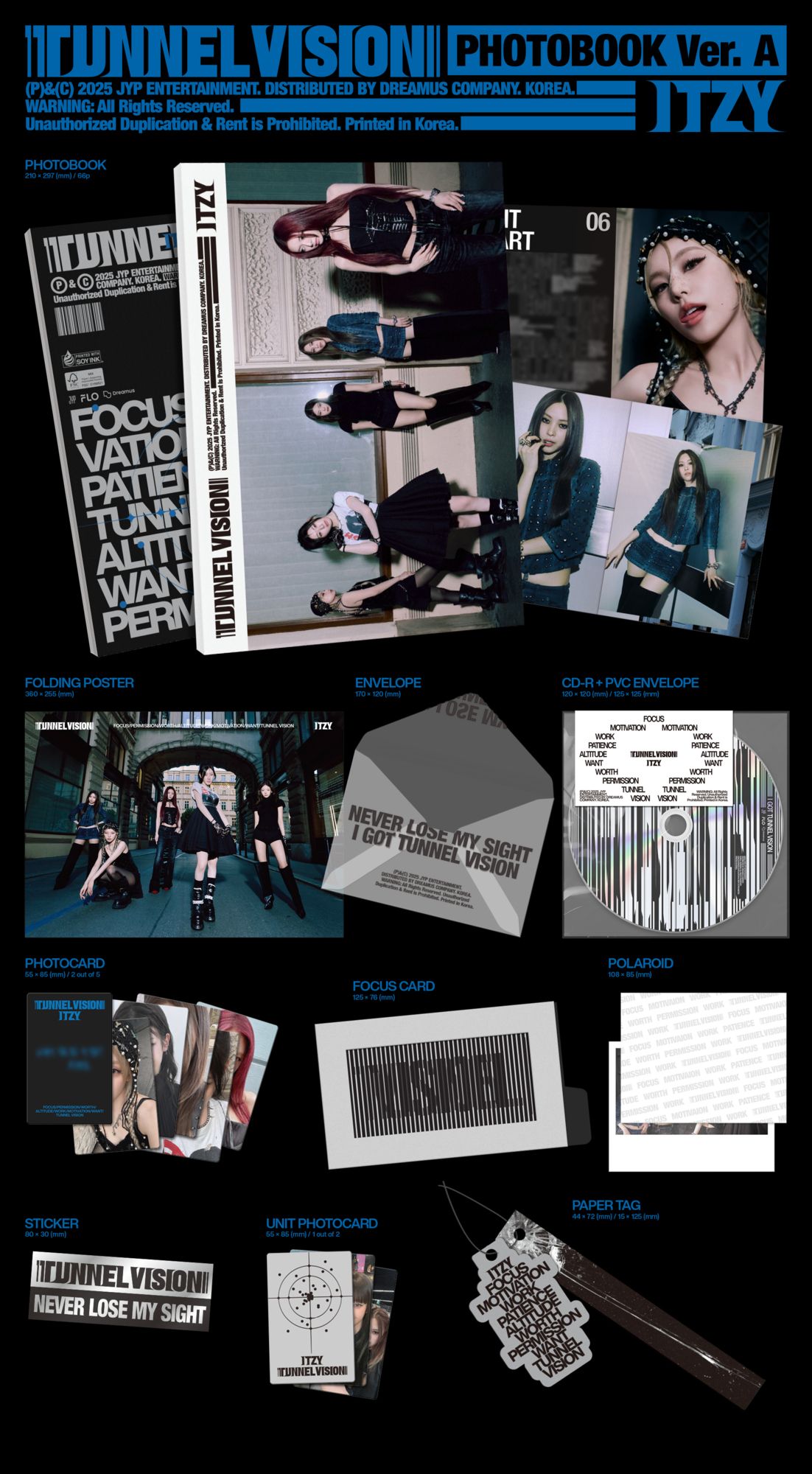 ITZY (YEJI, LIA, RYUJIN, CHAERYEONG & YUNA) are back with their new album titled 'TUNNEL VISION' available in two Photobook Versions - A ver. And B ver. Contents of the album include: CD, PVC Envelope, Photobook (66 pages), Folding Poster, Envelope, Photocard (2 of 5), Polaroid, Sticker, Unit Photocard (1 of 2), Paper Tags (2ea). A ver.: Focus Card / B Ver.: Target Card. Dimensions: 298 x 212 x 13 mm.